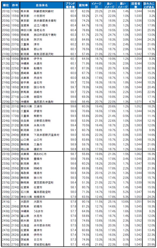 ランキング50位以内には、いわゆる観光地としての知名度が高いわけではなさそうな自治体もランクインしており、特産物の知名度の高さや地域特性が背景にあると考えられます。例えば、25位の京都府宇治市(宇治茶)、29位の茨城県つくば市(学術・研究都市)、36位の愛媛県今治市(今治タオル)、40位の兵庫県芦屋市(高級住宅地としての知名度)、49位の新潟県魚沼市(魚沼コシヒカリ)といった自治体です。昨年は、ブランド偏差値が50未満で順位が非公開となっていた大阪市ですが、今年は241位へと大きく順位を上げた点が注目されます。これは大阪・関西万博が経済効果だけではなくブランド向上にも大きく寄与したことを示しています。
