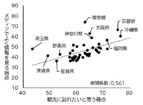 ・「観光に訪れたい」という設問との相関係数を算出すると、「メディアでよく情報を見る」「観光等で行ったことがある」という設問との相関係数はそれぞれ0.561、0.501となっています。