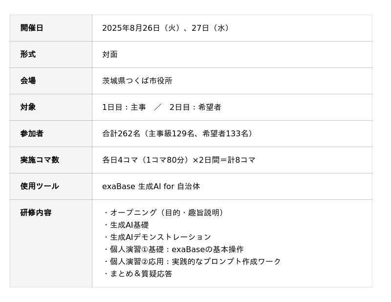株式会社TENHO(本社:東京都渋谷区、代表取締役:田村 允/土田 龍矢、以下「当社」)は、2025年8月26日(火)・27日(水)の2日間、茨城県つくば市役所(市長:五十嵐 立青)にて、市職員を対象とした生成AI研修を実施しました。使用ツールは「exaBase 生成AI for 自治体」で、主事を中心とした1日目と希望者を対象とした2日目に分け、全8コマのプログラムを展開。延べ262名が参加し、個人演習を中心とした実践的な内容を通じて、行政現場での生成AI活用を推進しました。