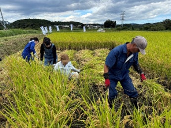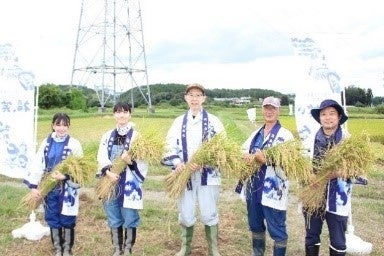 令和7年9月22日(月)、福島県いわき市沼部町において内堀 雅雄福島県知事、いわき福、笑い研究会の安島 美光会長、井塚 雄三事務局長、「福、笑い」WebCMに出演している福島県須賀川市出身の俳優である峰平 朔良さん、ふくしまライシーホワイトの荒木 愛香さんが福島県トップブランド米「福、笑い」の稲刈りを行いました。稲刈りに参加した5人は、5月に田植えした「福、笑い」の豊作を喜びながら収穫しました。