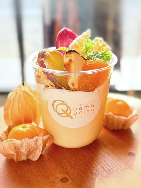 バスクチーズケーキをパフェスタイルのドリンクに仕立てました。トッピングには花貫フルーツほおずきのコンフィチュールや老舗和菓子店の八千代おこし、紅はるかの焼き芋など、高萩の美味しいものをふんだんにのせて華やかに仕上げた新感覚のスイーツです。