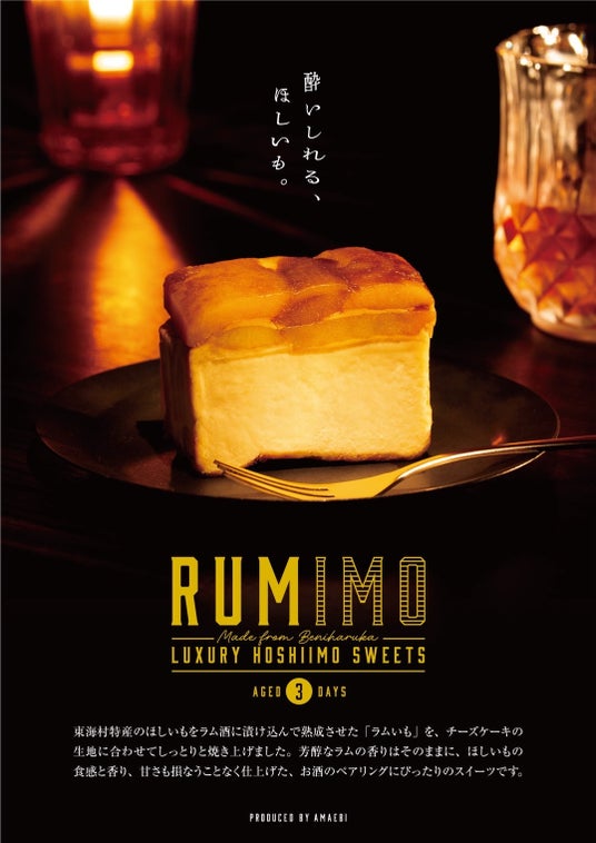 干し芋の残渣をラム酒に付けチーズケーキと合わせ、生地の中にも残渣のパウダーを加え,アルコール成分を飛ばして作り上げた大人なスイーツ。