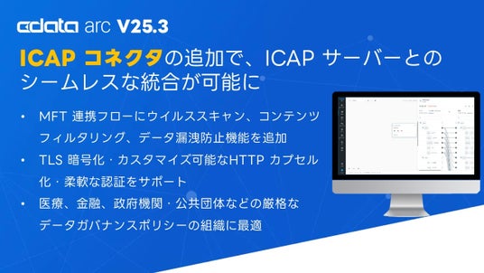 本アップデートで新しく搭載されたICAP(Internet Content Adaptation Protocol)コネクタにより、ICAP サーバーとのシームレスな統合が可能になりました。これにより、ユーザーはMFT 連携フローにウイルススキャン、コンテンツフィルタリング、データ漏洩防止機能を追加できます。ICAP コネクタは、TLS 暗号化、カスタマイズ可能なHTTP カプセル化、柔軟な認証をサポートしているため、厳格なデータガバナンスポリシーのもとでも使用可能です。特に医療、金融、政府機関・公共団体をはじめとするセキュリティを重視する組織には最適の機能です。
