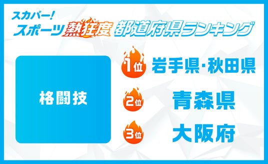 プロレスは、1位高知県、2位山梨県、3位岩手県という結果になりました。格闘技では1位岩手県、秋田県、2位青森県、3位大阪府という結果になりました。プロレスで1位となった高知県では昨今人気急上昇中の女子プロレスの大会『STARDOM in KOCHI 2025』が開催されるなど、有名選手の参加などが要因だと考えられます。格闘技1位の岩手県では八重樫 東さんをはじめとする多くの世界王者を輩出するなど、有名選手が多いことも要因だと考えられます。