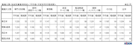 職種大分類別の平均時給は、「専門・技術職」1,334円(前年同月比50円増)、「製造関連・ドライバー職」1,243円(同88円増)、「清掃・メンテナンス職」1,217円(同47円増)、「飲食サービス職」1,179円(同90円増)、「事務職」1,170円(同7円増)、「販売・接客サービス職」1,166円(同53円増)の順で、前年同月比で全ての職種がプラスとなった。都県別の平均時給は、東京都1,248円(前年同月比56円増)、神奈川県1,231円(同63円増)、埼玉県1,168円(同54円増)、千葉県1,168円(同59円増)の順となり、前年同月比で全ての都県がプラスとなった。