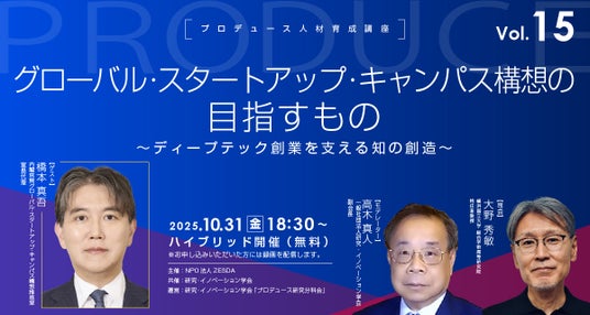 第15回プロデュース人材育成講座は、内閣官房グローバル・スタートアップ・キャンパス構想推進の橋本 真吾さんをゲストにお招きし、グローバル・スタートアップ・キャンパス(GSC)構想の全体像と意義についてお話しいただきます。