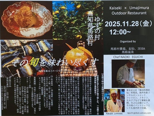 馬路村農協とZESDAは、ゆずの収穫期で村全体がゆずの香りに包まれる11月28日(金)に、一日だけの特別な屋外レストランイベントを開催します。