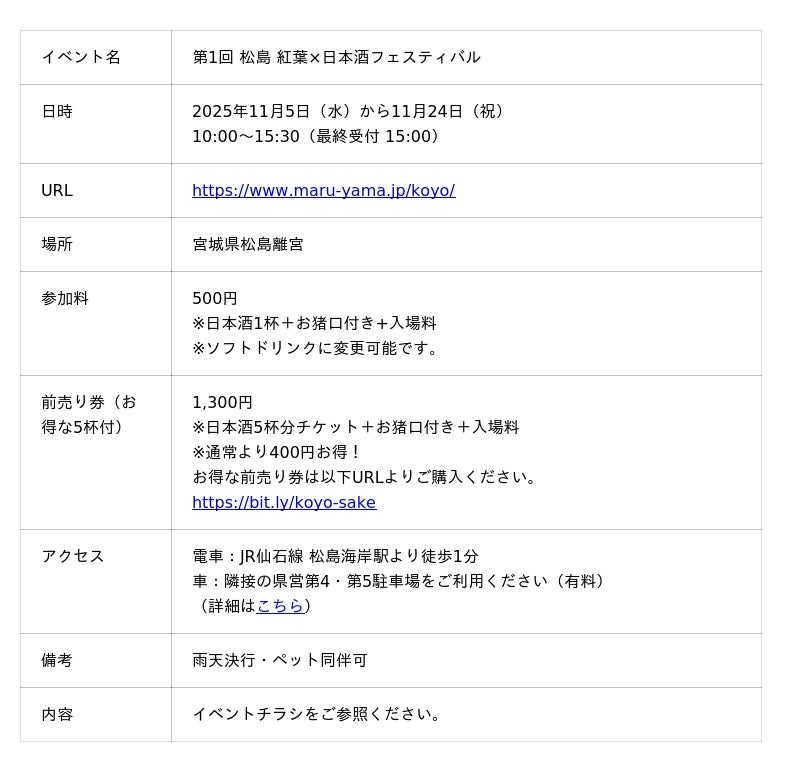 日本三景 松島にある観光複合施設「宮城県松島離宮」(運営:丸山株式会社)では、11月5日(水)より「第1回 松島 紅葉×日本酒フェスティバル」を開催します。