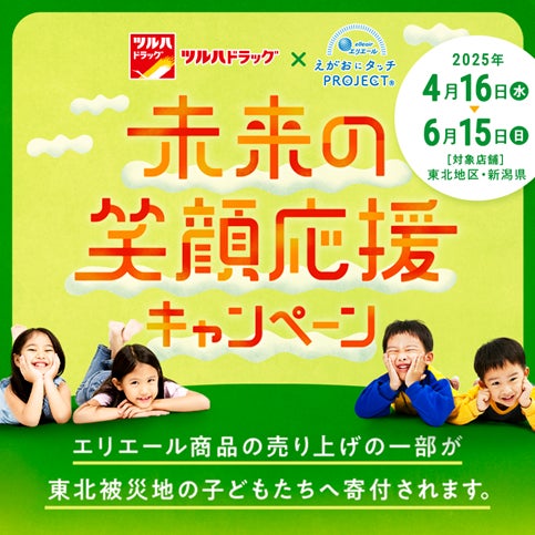 「エリエール えがおにタッチPROJECT」に賛同いただいたツルハドラッグと協同で、「未来の笑顔応援キャンペーン」を2025年4月16日(水)~6月15日(日)に実施しました。期間中に東北地区・新潟県のツルハドラッグ店舗にてエリエールブランドの商品をお買い上げいただくと、売り上げの一部が東北被災地の子どもたちに寄付されるキャンペーンです。