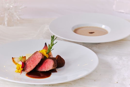 キノコのクリームスープ/牛ランプステーキ BBQソース 燻製ブラックペッパーの香り