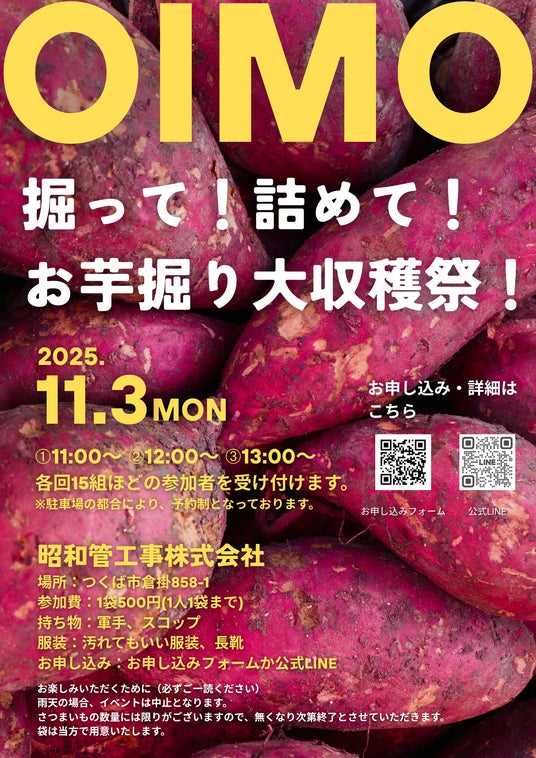 お子さまからご年配の方までどなたでもご参加いただけるこのイベントは、自然の恵みを体いっぱいに感じられる秋の恒例行事として好評いただいております。袋に詰め放題でお芋を持ち帰れる体験や、地元野菜の直売、キッチンカー出店なども予定しており、地域全体が一体となって楽しめる一日となっております。地域の皆さまとのふれあいの場として、また、昭和管工事をより身近に感じていただける機会として企画いたしました。