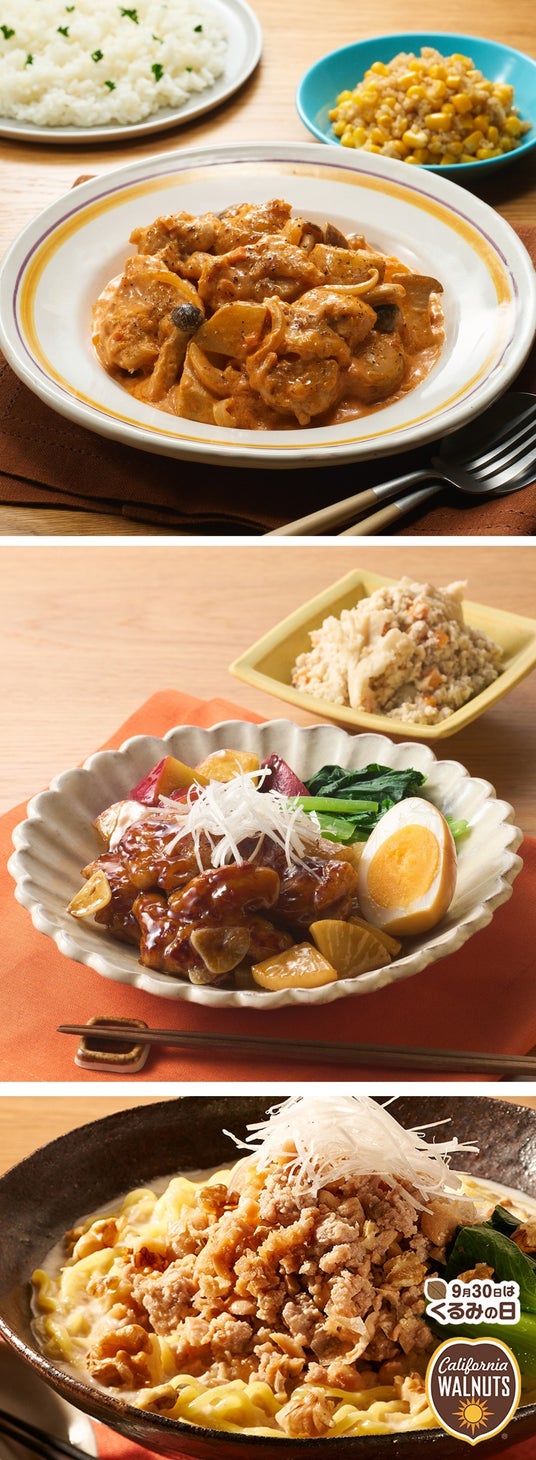 豆乳とねりごまが入ったクリーミーな担々麺。お子さまも食べられるよう辛さ控えめに仕上げており、お好みでご自宅のラー油などで調整していただけます。肉みそには砕いたくるみを入れることで食べ応えアップ。甘酸っぱい中華風の和え物と一緒にお召し上がりください(カリフォルニアくるみ協会とのコラボメニュー)。