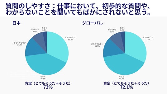 インクルージョンサーベイ(調査)では、外国籍社員、日本人社員、共に「質問しやすい(外72.1%、日73%)」「失敗を恐れずに挑戦できる(外73.6%、日63.8%)」と回答する割合が高い数値となりました。