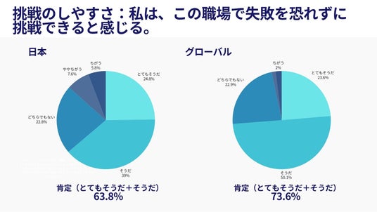 挑戦のしやすさに関しては、双方高い数値ではあるものの、外国籍社員と比べて日本人社員の方が10%低く、日本人特有の慎重さが影響している可能性が示唆されます。ある調査では、社会人4年目以降の日本人の52.3%※4 が「仕事で挑戦をしたことがない」と回答しています。これを踏まえると、今回の双方共に高い数値結果は対照的であり、注目すべき点といえます。