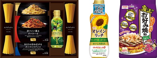 左から)こだわりのパスタセット、オレインリッチ、おいしく焼ける魔法のお好み焼粉