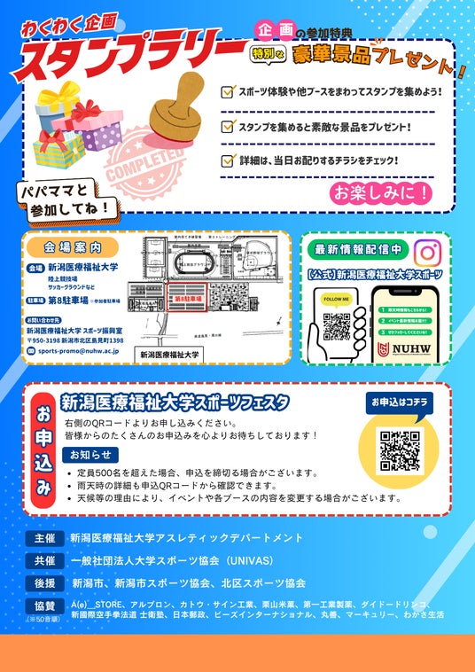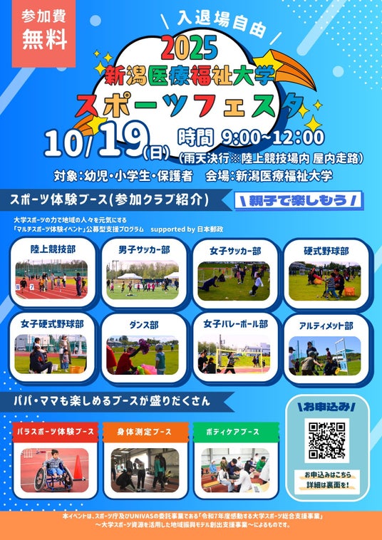 NSGグループの新潟医療福祉大学は10月19日(日)に幼児や小学生、保護者を対象とした「新潟医療福祉大学スポーツフェスタ」を開催します。本イベントは、スポーツ庁及びUNIVAS(大学スポーツ協会)の委託事業「令和7年度感動する大学スポーツ総合支援事業~大学スポーツ資源を活用した地域振興モデル創出支援事業~」の一環として実施するもので、子どもの運動不足・スポーツ離れの進行や、市民がスポーツに親しむ環境・機会の不足といった地域課題の解決を目指しています。