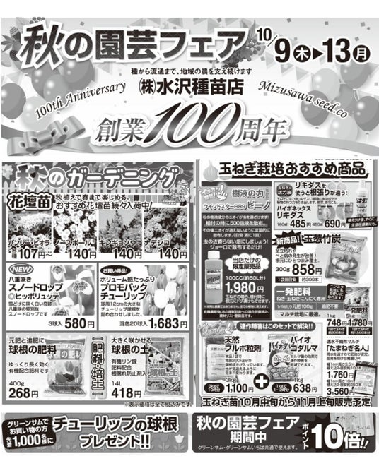 創業100周年を迎える株式会社水沢種苗店(本社:宮城県石巻市、代表取締役:水澤長之)が運営する園芸専門店「グリーンサム」では、2025年10月9日(木)から10月13日(月・祝)までの5日間、「秋の園芸フェア」を開催いたします。