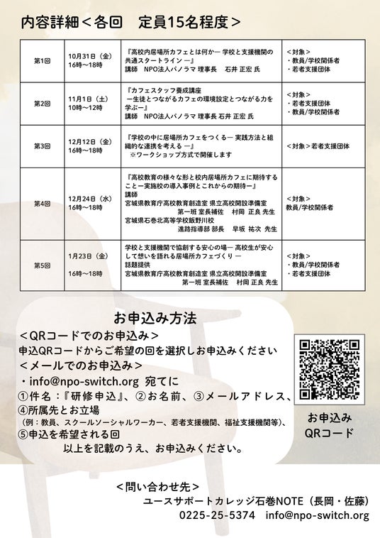 現在居場所カフェを実施している学校関係の方や若者支援団体、これから実施したいと考えている学校関係の方や若者支援団体の皆様、この機会にぜひご参加ください。