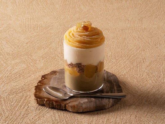りんごのやさしい味わいとさつまいも餡のモンブラン。さらに、ほうじ茶のなめらかプリンも楽しめる、秋の新作スイーツです。ほうじ茶のプリンの上に、小麦不使用の米粉スポンジ・自家製グラノーラ・国産りんごのコンポートを合わせ、さらに国産りんごのピューレ入りムースを重ねました。仕上げは、さつまいも餡をモンブラン風に絞り、甘露煮をトッピング。