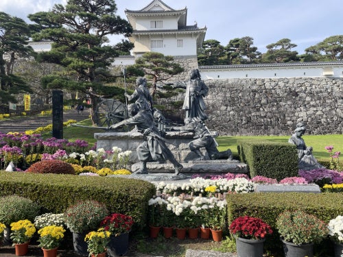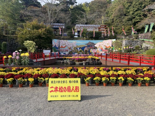 菊人形会場となる霞ヶ城公園の、由緒ある庭園の紅葉も会期中に見頃を迎え、艶やかな菊の花と色づく紅葉を楽しめます。