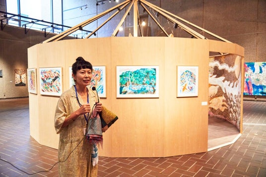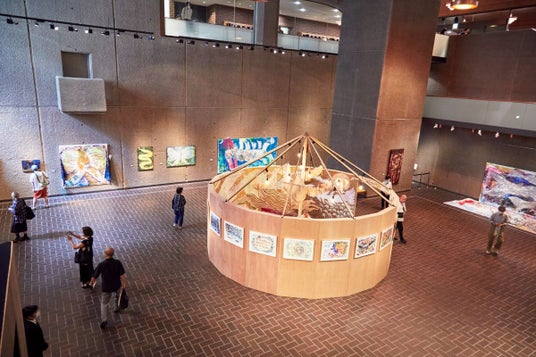 ひとつ下の階(ギャラリーA)の吹き抜け展示室にはミロコマチコの勢いのある作品世界が広がる。大阪府生まれのミロコマチコは、11年にわたる東京での活動を経て、2019年奄美大島に移住した。展示空間の中央には《島》がつくられ、その周りには奄美大島で制作された作品が多く展示されている。
