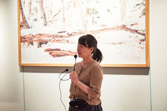 「誰もいない、誰も来ない深い森の中で突然現れた風景に驚き、喜びと、恐怖も感じたことを覚えています」という榎本の言葉を大橋学芸員が伝え、積もった白い雪--榎本が出会った自然をみずみずしい感性でとらえた作品であると紹介した。白黒にシンプルに削られた作品だからこと、見る人が自分の記憶と結び付け自由に想像を広げる余白をもっている。