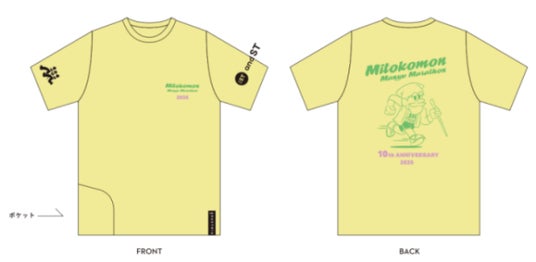 黄色がベースのTシャツに、水戸黄門さまが走っているキャラクターは女性やお子さまも着たくなるようなポップなデザインです。