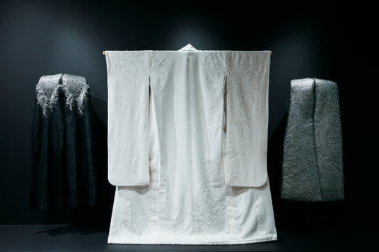 セヴェンヌの⽩に私は、何物にも汚されていない自然の真っ直ぐな強さを感じ、畏敬の念を抱きます。この作品ではセヴェンヌの⽷で織った生地を、純粋さを象徴する真っ⽩な着物へと仕上げました。姫の姿を現代の人にも身近に感じていただくために、着物という形での表現を行なっています。表面にきらめく水晶は、現在セヴェンヌの養蚕に取り組んでいる山形の地を訪れたときに感じた大地の恵みと、「水」のイメージから着想しています。