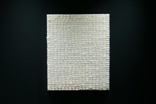 蚕の繭は本来画材ではありませんが、生命への感謝と慈しみを込めて、蚕が自らの命を賭してつくり上げた繭そのものを作品に用いています。人と蚕の互いへの想いを感じながら、繭を一つひとつ画面に置いていきました。作品名の《Apoptosis(アポトーシス)》とは、生き物が命を繋いでいくために、細胞にあらかじめプログラムされている「細胞死」のことを指します。繭を作品へと生まれ変わらせ、新たな命を誕生させようとした作品です。