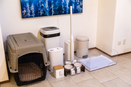 クレート、トイレ、トイレシート6枚、散歩用エチケット袋6枚、おやつ、食器、バスタオル、足ふきタオル