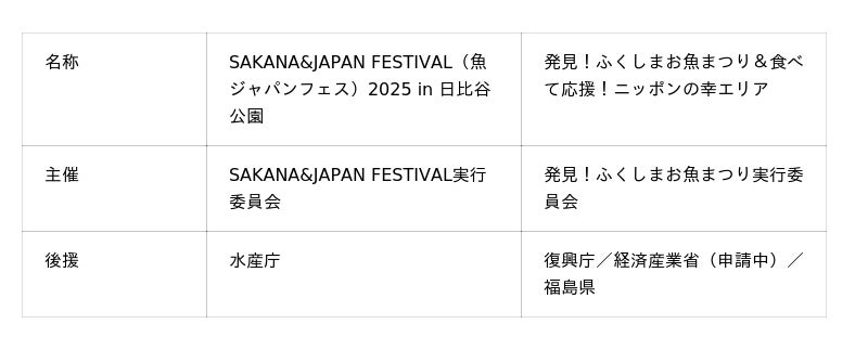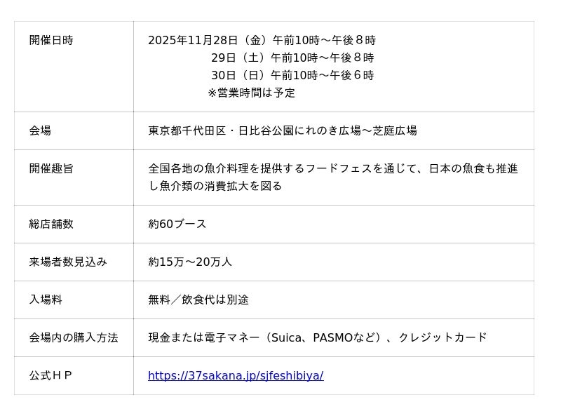 全国各地の魚介グルメが味わえる「SAKANA&JAPAN FESTIVAL(魚ジャパンフェス)2025 in 日比谷公園」(主催・SAKANA&JAPAN FESTIVAL実行委員会)が2025年11月28日(金)~30日(日)の3日間、東京都千代田区の日比谷公園で開催されます。