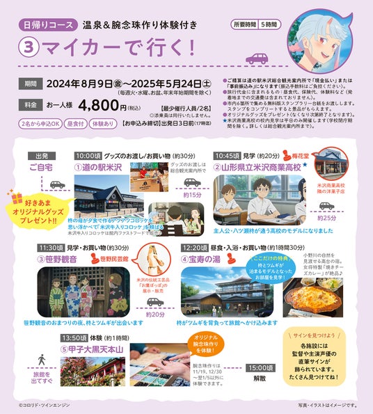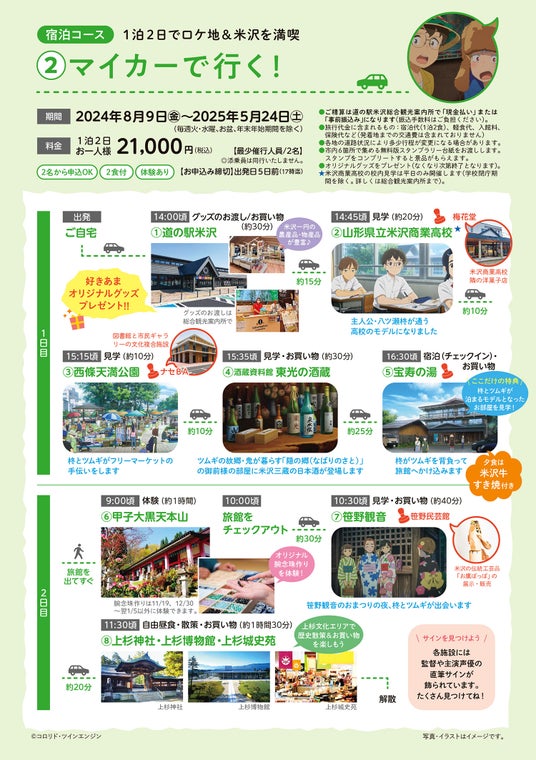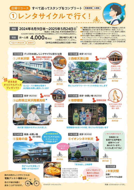 2024年6月より開催中の「好きあまロケ地巡礼スタンプラリー」をベースに、電動アシスト機能付きレンタサイクルとマイカーで米沢市内のロケ地やスタンプラリーポイントを巡る旅行商品を3コースご用意しました。