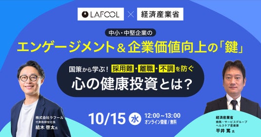 人的資本/ウェルビーイング経営支援の株式会社ラフール(本社:東京都中央区、代表取締役社長:結木啓太 以下「ラフール」)は、2025年10月15日(水)に、経済産業省 商務・サービスグループ ヘルスケア産業課 平井篤 氏をお招きし、『国策から学ぶ!採用難・離職・不調を防ぐ「心の健康投資」とは?中小・中堅企業のエンゲージメント&企業価値向上の鍵』をテーマとしたセミナーを開催します。