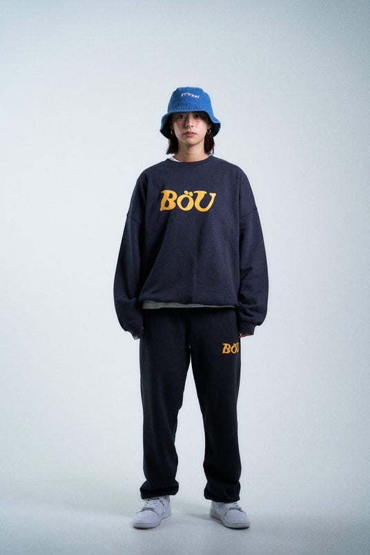 & SWEAT PANTSBoU 2025AWコレクションを象徴するスウェットセットアップ。