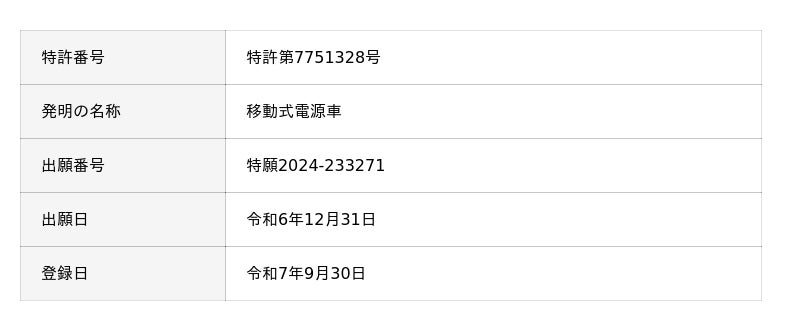 ベルエナジーはこれまで、EVバッテリー応用技術を活用した「MESTA」シリーズや、移動式充電サービス「電気の宅配便」を通じて、モバイル電源車の開発・運用実績を積み重ねてきました。今回の特許取得は、これらの開発の延長線上に位置づけられるものであり、EVを次世代の電力インフラとして再定義する大きな一歩となることを期待しております。