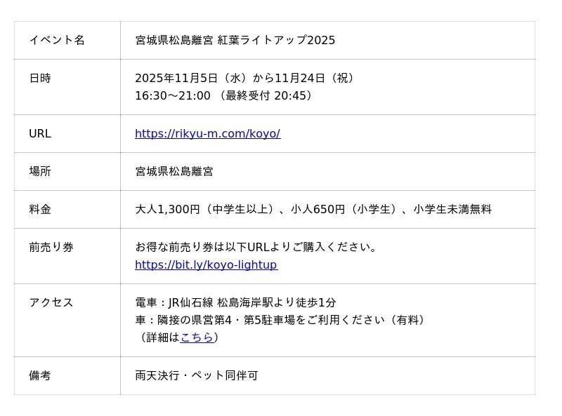 日本三景 松島にある観光複合施設「宮城県松島離宮」(運営:丸山株式会社)では、11月5日(水)より「宮城県松島離宮 紅葉ライトアップ2025 」を開催します。