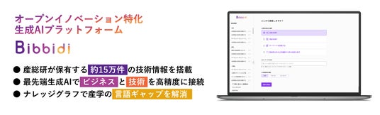 「Bibbidi」は、産総研が保有する約15万件の膨大な技術情報(シーズ)を核に、企業の事業課題/市場課題などの情報(ニーズ)と結びつけることで、産学連携によるオープンイノベーション創出を加速する生成AIプラットフォームです。