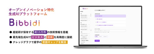 「Bibbidi」は、産総研が保有する約15万件の膨大な技術情報(シーズ)を核に、企業の事業課題/市場課題などの情報(ニーズ)と結びつけることで、産学連携によるオープンイノベーション創出を加速する生成AIプラットフォームです。