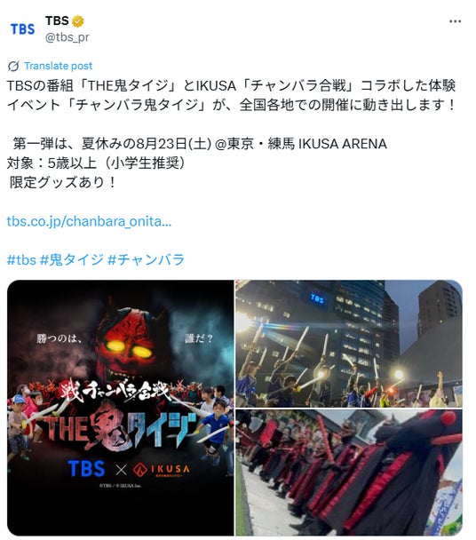 年間1,400件以上の体験型イベントを企画・運営する「あそび総合カンパニー」株式会社IKUSA(本社:東京都豊島区、代表取締役:赤坂大樹)は、TBSテレビの人気番組『THE 鬼タイジ』とコラボレーションした新イベント「チャンバラ合戦 THE 鬼タイジ」の提供を開始しました。