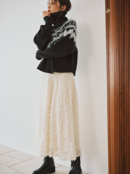 1点投入で冬らしさが漂う柄ニットはジャカードスカートを合わせてレディに
