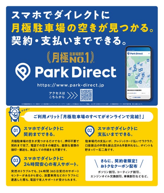 「Park Direct(パークダイレクト)」(https://www.park-direct.jp)は、株式会社ニーリーが運営する、月極駐車場をオンラインで検索・申込・契約できるサービスです。スマホやパソコンから現在地や住所で簡単に検索でき、オンラインで申込、契約、クレジットカードでの決済まで可能。最短約5分で月極駐車場をご利用いただけます。また、希望する駐車場が満車の場合でも「空き待ち予約」をすれば、空きが出た際にお知らせを受け取れます。Park Direct(パークダイレクト)は、オンライン契約可能台数業界No.1(※1)!