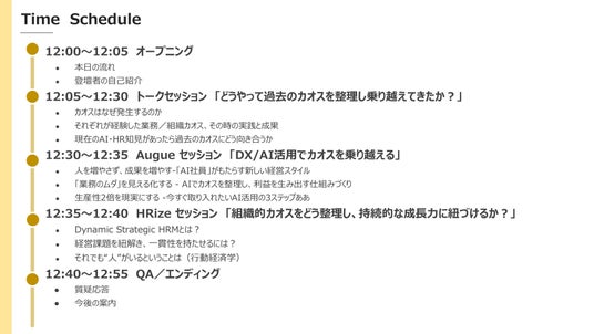 本セッションでは、業務整理×AI・DX導入(Augue)と人と組織の最適化(HRize)の両側面から、