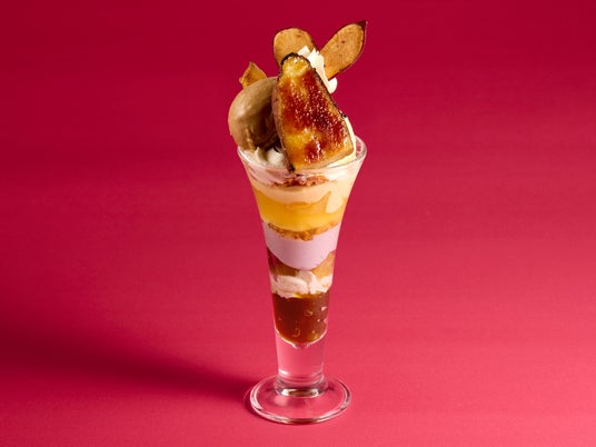 濃厚な甘みの茨城県産“紅はるか”の焼きいもをブリュレして、塩キャラメル&ナッツアイスやおいもチップスと一緒にトッピングしたビッグパフェです。ねっとりとした“紅はるか”の焼きいもと、ブリュレすることによりパリパリに仕上げた砂糖、カリッとしたおいもチップスの食感のコントラストがクセになります。