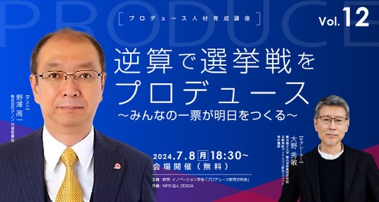 プロデュース人材育成講座 Vol.12として、「逆算で選挙戦をプロデュース ~ みんなの一票が明日をつくる ~」を2024年7月8日に開催いたしました。
