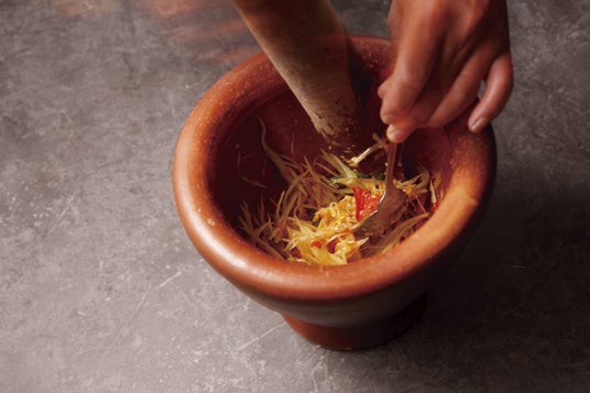 天草産車海老とホタテ貝のヤムウンセン(ヤムウンセン タレー)や本日鮮魚の生春巻きなど、新鮮な素材を活かした彩り豊かな料理を取り揃えております。青パパイヤのサラダ(ソムタム)は、お客さまの目の前でクロックに材料を入れ潰しながら仕上げるライブ感を楽しめます。