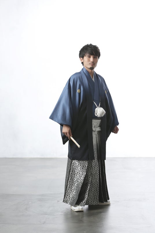 ネイビー×亀甲柄 生地:化織 色:紋服(ネイビー)袴(シルバー×黒)生地:化繊