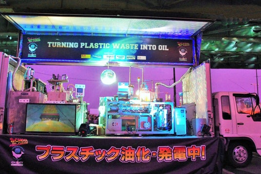 【プラスチック油化システムを搭載した大型トラック】一般社団法人エコパーティが所有する、大型の「プラスチック床装置」によってプラスチックごみからプラスチックオイルを生成し、イベントのステージで使用する電力として再利用します。