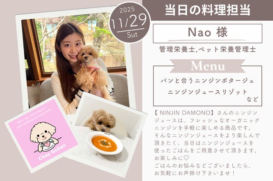 当日の料理は、管理栄養士でありペット栄養管理士のNao様が担当いたします(料理内容は状況により変更する場合がございます)。