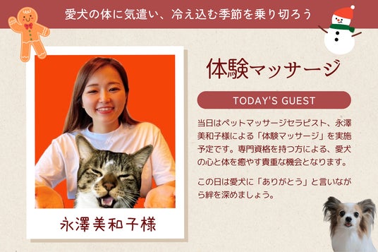 当日はペットマッサージセラピスト、永澤美和子様による「体験マッサージ」を実施予定です。専門資格を持つ方による、愛犬の心と体を癒やす貴重な機会となります。