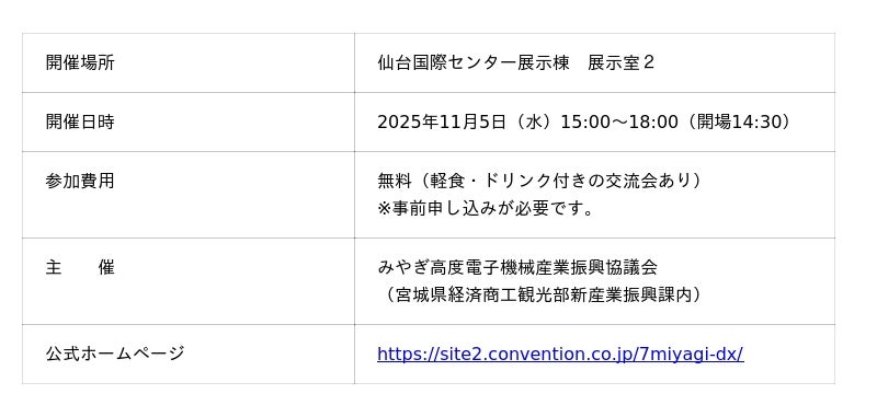 宮城県では、2025年11月5日(水)宮城県中小製造業DX推進イベント『Mirai DX カンファレンス』を仙台国際センターで開催いたします。